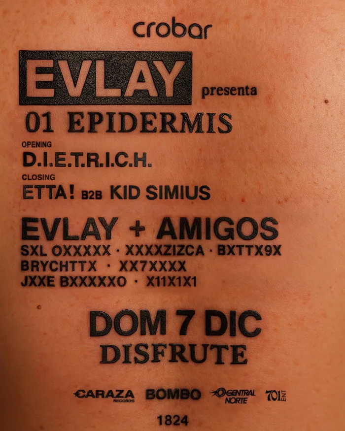 EVLAY presenta oficialmente su nuevo álbum “EPIDERMIS” con un show único que propone una experiencia sensorial integral. El lanzamiento, que redefine su búsqueda estética y sonora, tendrá su primera presentación en vivo el domingo 7 de diciembre en Crobar a las 23hs. El artista compartirá escenario con D.I.E.T.R.I.C.H., ETTA!, Kid Simius y varixs amigxs más , en un line-up especialmente curado para este acontecimiento, noche en la que el productor inaugura esta nueva etapa.